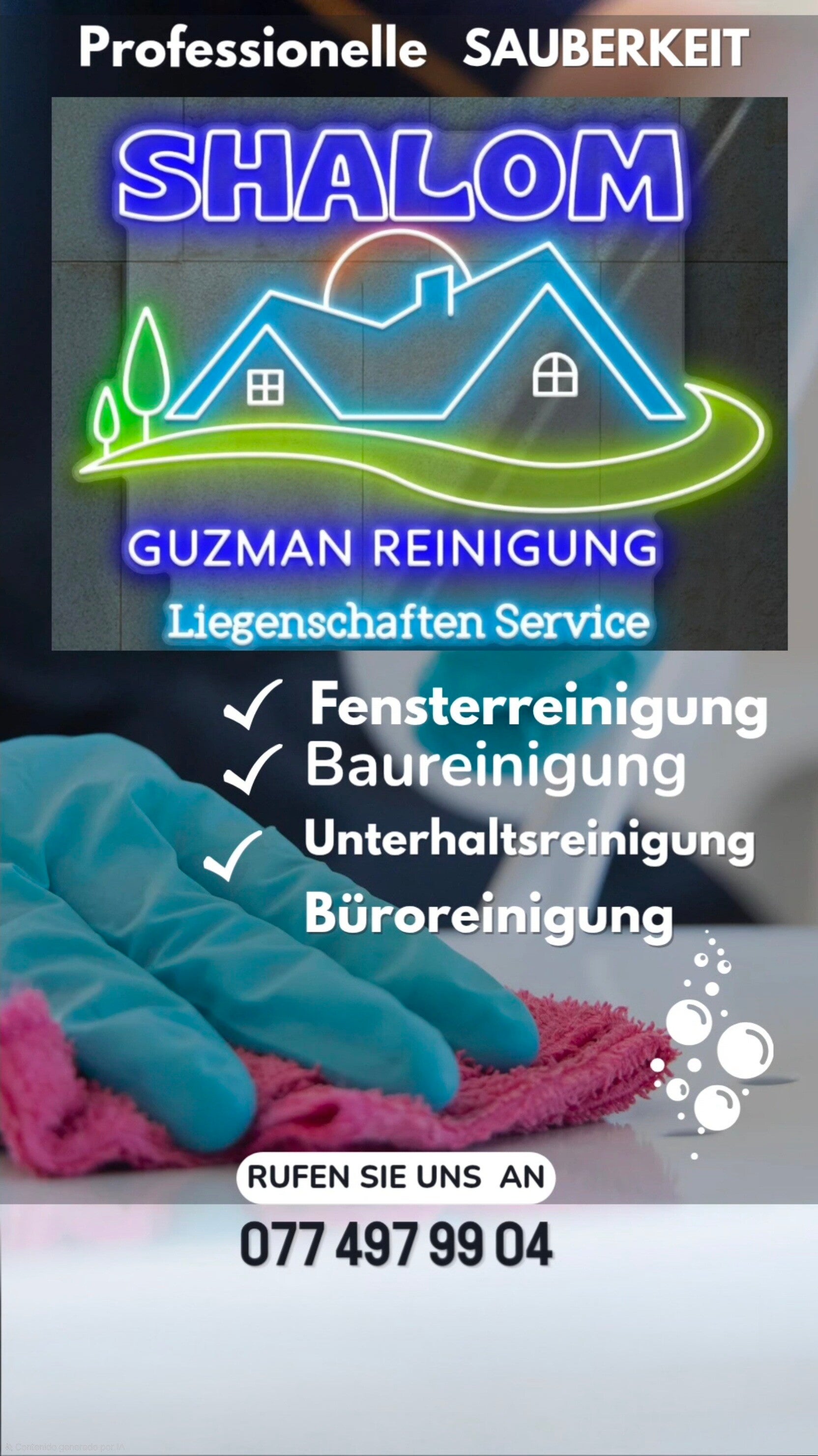 Willkommen bei Shalom Guzman Reinigungen. Wir bieten professionellen Reinigungsdiensten. in Hombrechtikon und Umgebung an. Entdecken Sie unser Engagement für makellose Ergebnisse und hervorragenden Kundenservice. Lassen Sie uns Ihren Blick auf die Welt wiederherstellen.